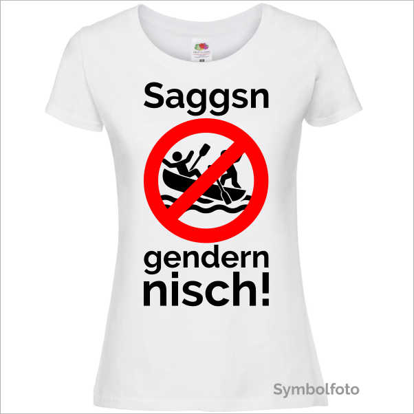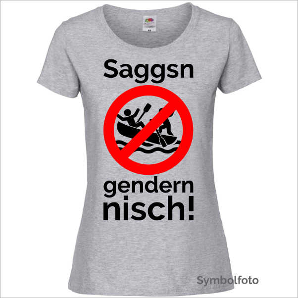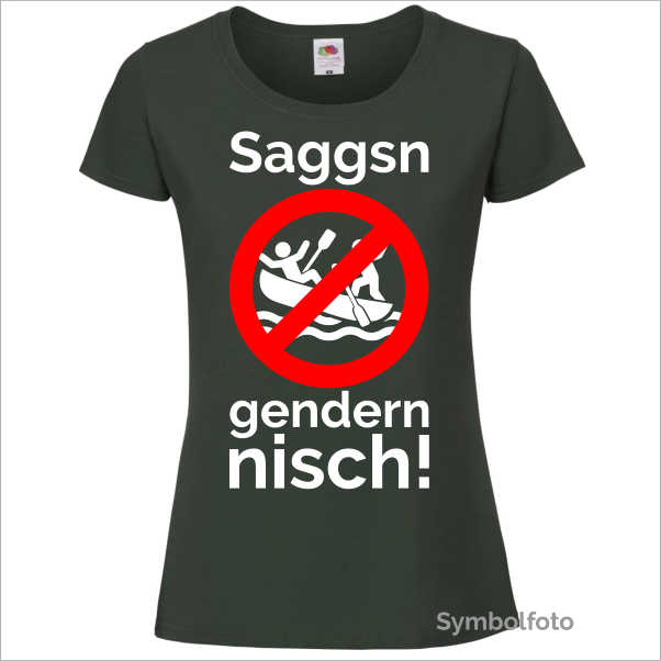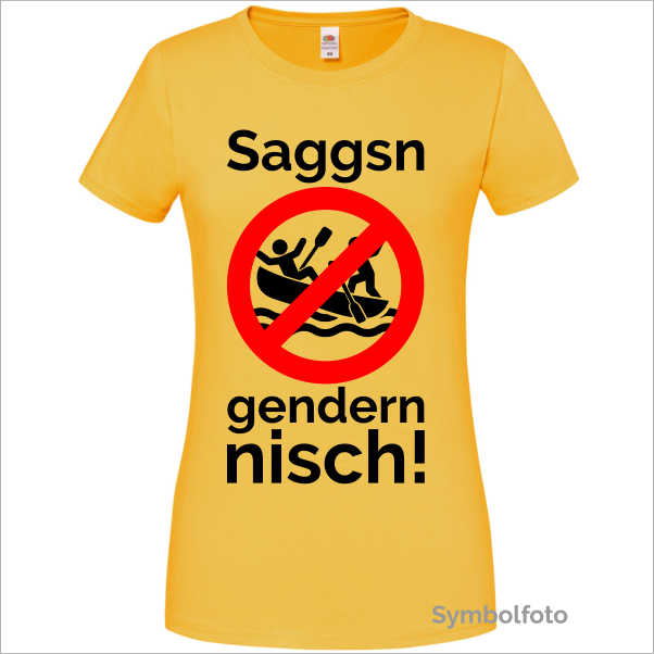 Qualitativ hochwertiges T-Shirt für Damen aus 100 % Baumwolle mit dem Motiv “Saggsn gendern nisch” (zu Deutsch: Sachsen gendern/kentern nicht) auf der Vorderseite in verschiedenen Größen und Farben.