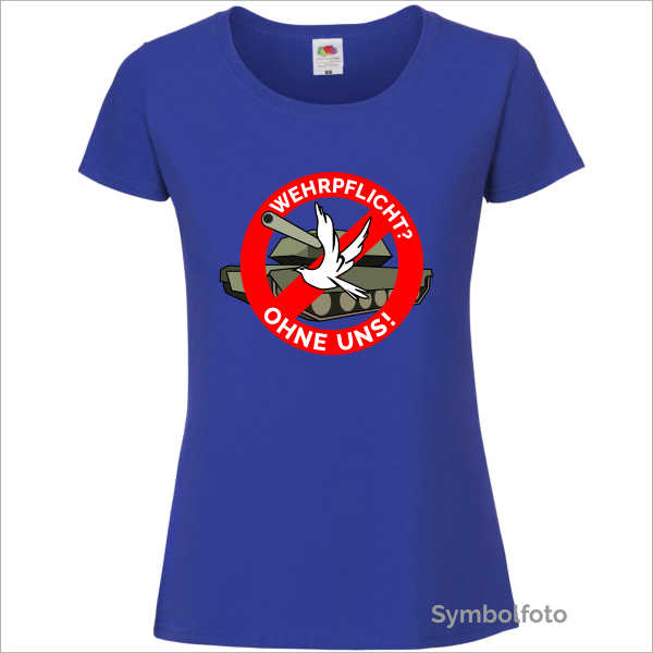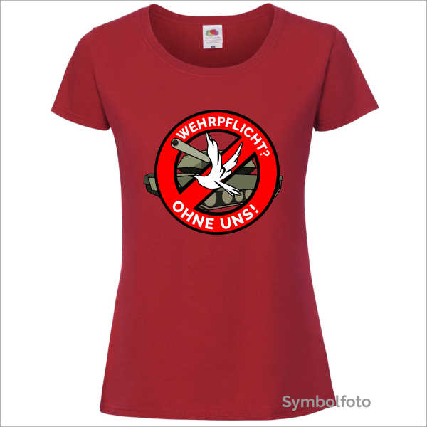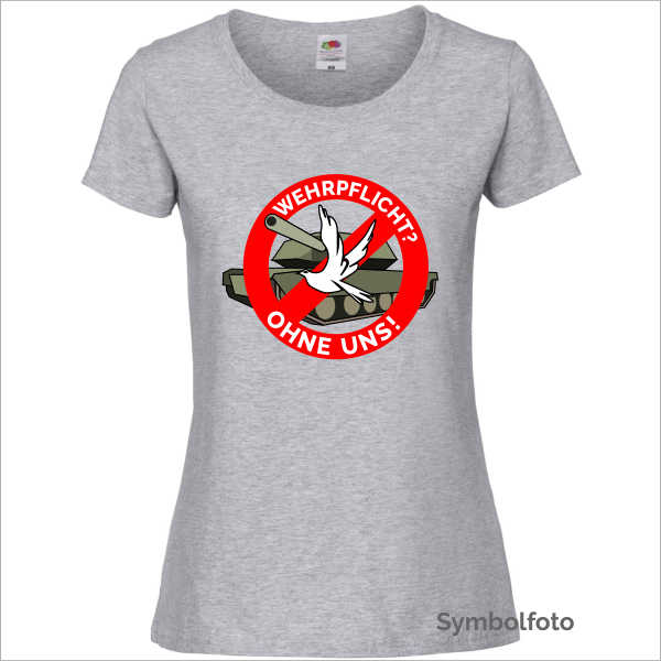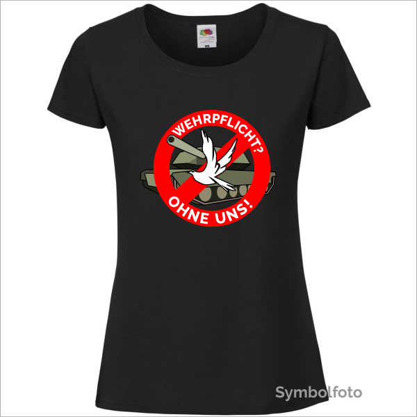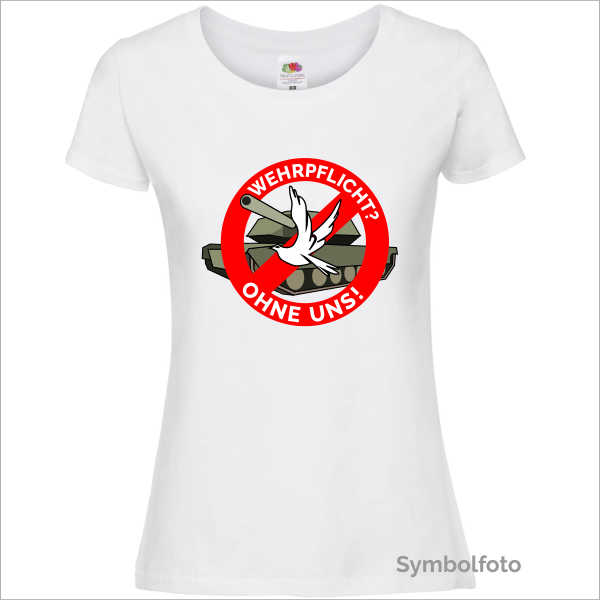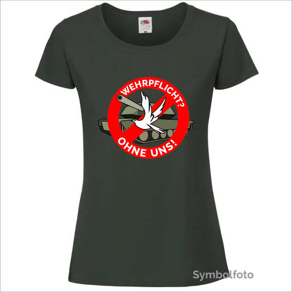 Qualitativ hochwertiges T-Shirt für Damen aus 100 % Baumwolle mit dem Motiv “Wehrpflicht? Ohne uns!” auf der Vorderseite in verschiedenen Größen und Farben.